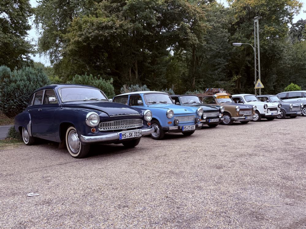 Unser erstes Ziel war ein Oldtimertreffen bei Marcs Classic Cars in Dortmund. Schon bei der Ankunft war klar: Unsere Ostblech-Kolonne war der Star des Tages. Kaum hatten wir das Gelände befahren, stürmten neugierige Besucher zu unseren Fahrzeugen – ein Zeichen dafür, dass der Charme des Trabis ungebrochen ist. Wir ergatterten noch ein schönes Plätzchen, an dem wir unsere Autos würdig präsentieren konnten.